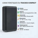 Grâce à sa batterie 3000 mAh et son mode veille intelligente, le Trackeo Compact offre une autonomie exceptionnelle :